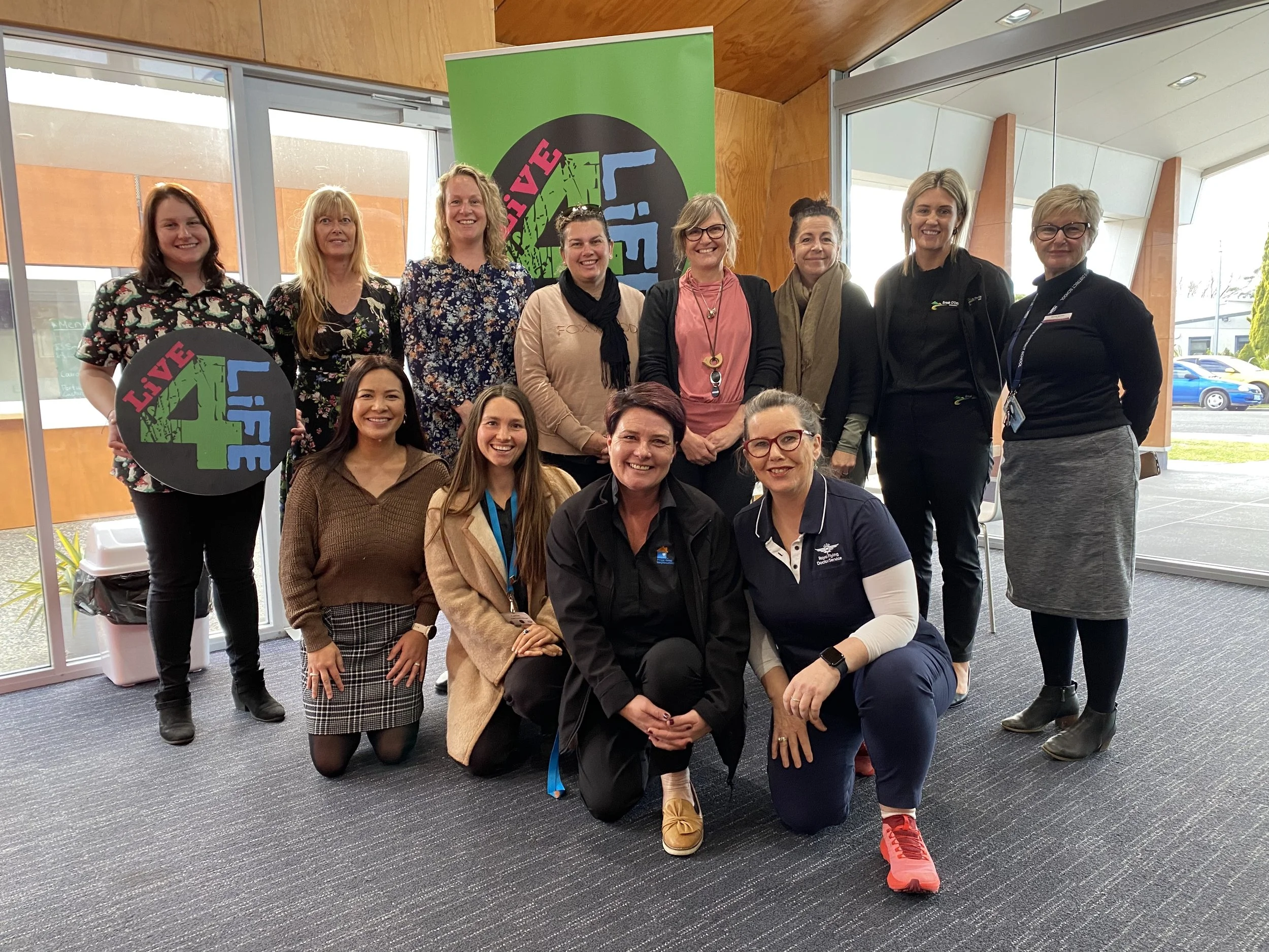 IMAGE (Left to Right) - Members of the Live4Life Break O'Day Partnership Group sitting and standing, smiling, in front of the Live4Life banner.